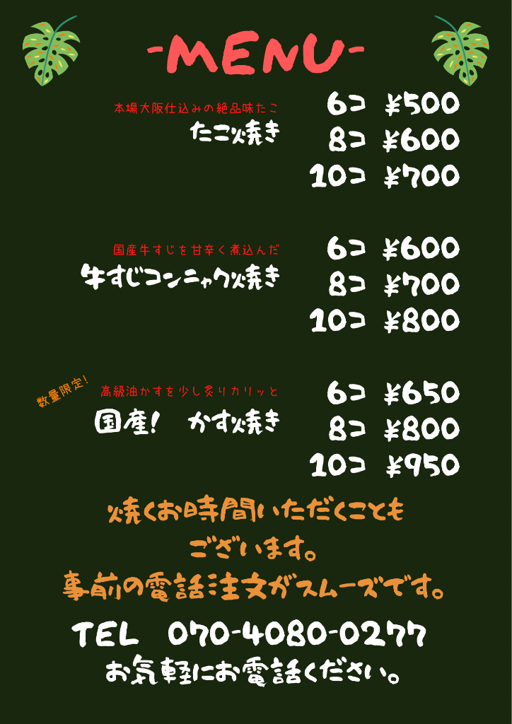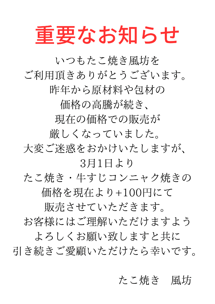 昨年からの原材料費高騰により、この度たこ焼きの価格改定させていただく事をお知らせします。