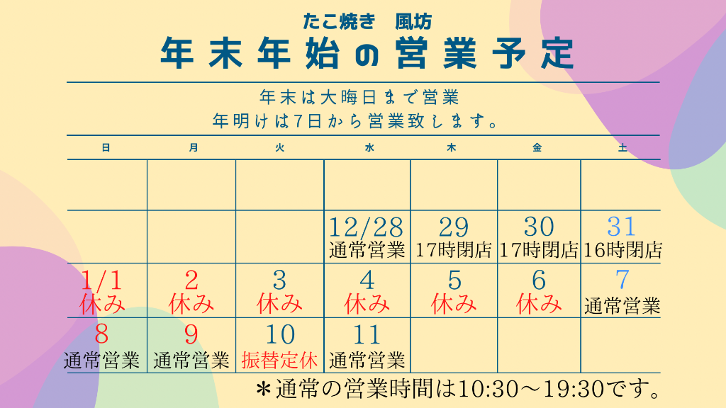えー、今年の年末年始の営業予定が決まりましたのでお知らせします。
